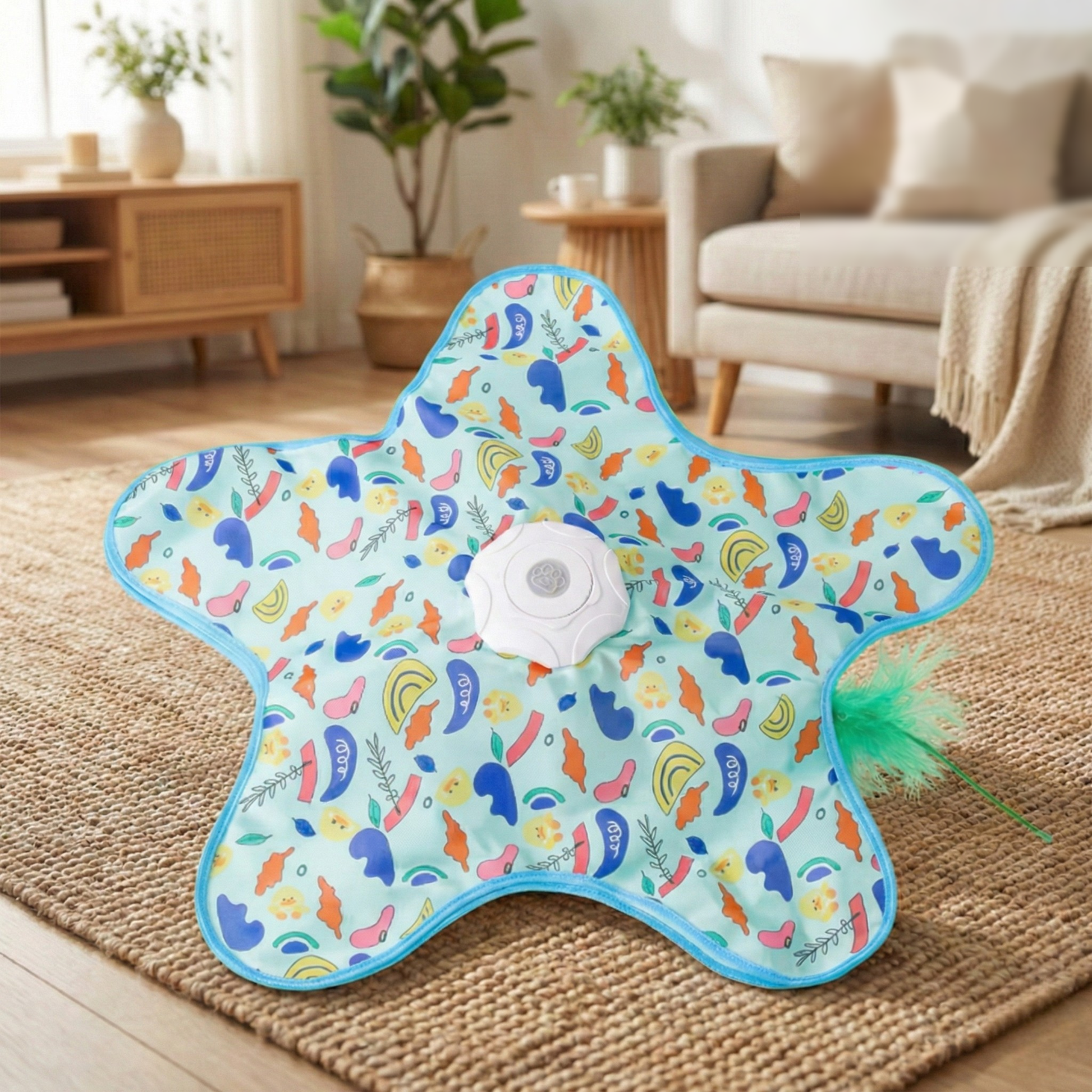 - Instinct de chasse stimulé : la plume surgit et disparaît au hasard pour éveiller sa curiosité, comme une véritable proie.